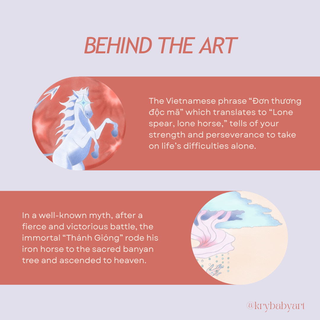 Limited edition Year of the Horse 2026 print is a mystical space-fantasy illustration rooted in Vietnamese legends and eastern motifs. Inspired by the Vietnamese proverb that translates to "Lone Spear, Lone Horse" this artwork signifies a fiery, transformative change for the year ahead and doubles as a functional calendar.
